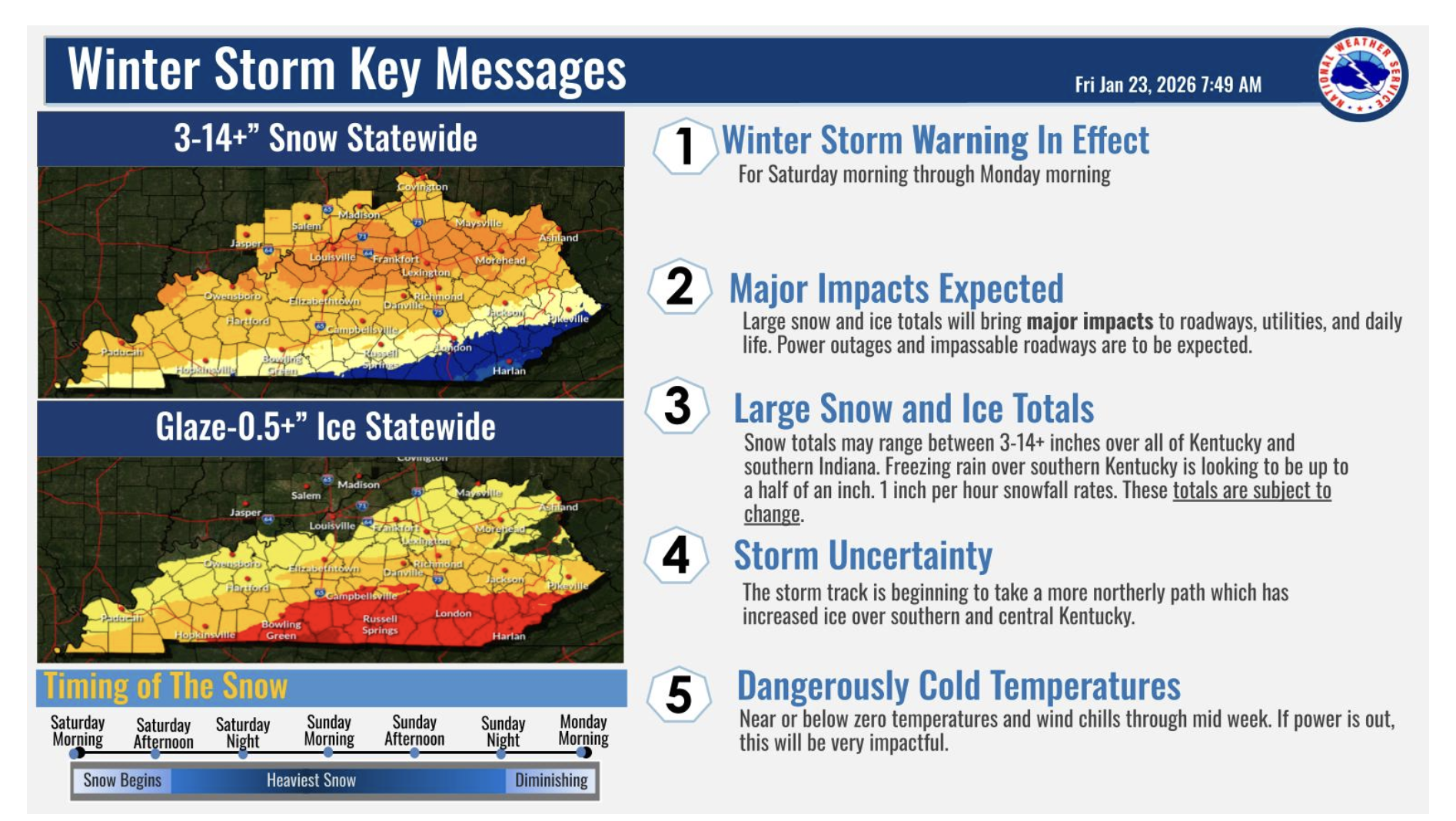 The National Weather Service is predicting widespread snowfall and ice across the state. Southern Kentucky is also bracing for significant ice accumulations.