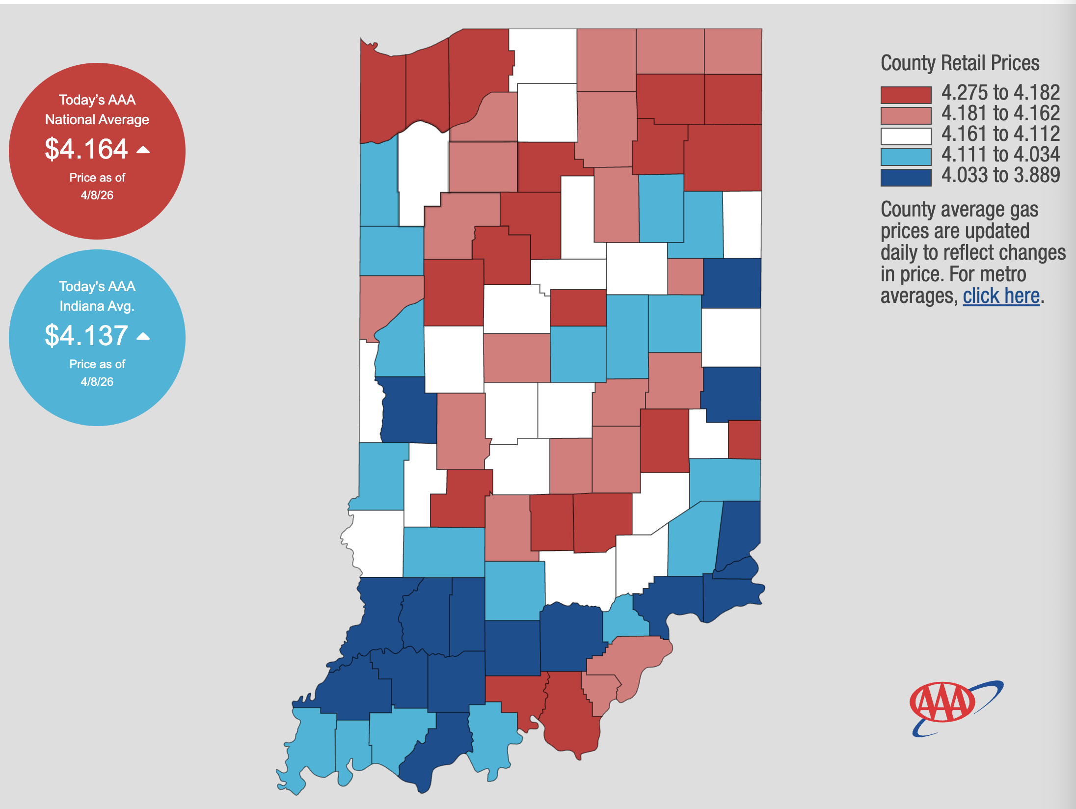 On Wednesday, AAA reported the national average jumped two-cents to $4.16 per gallon. Southern Indiana is seeing some of the highest gas prices in the state, according to AAA. With Crawford and Harrison County prices above the national average at $4.22 per gallon.